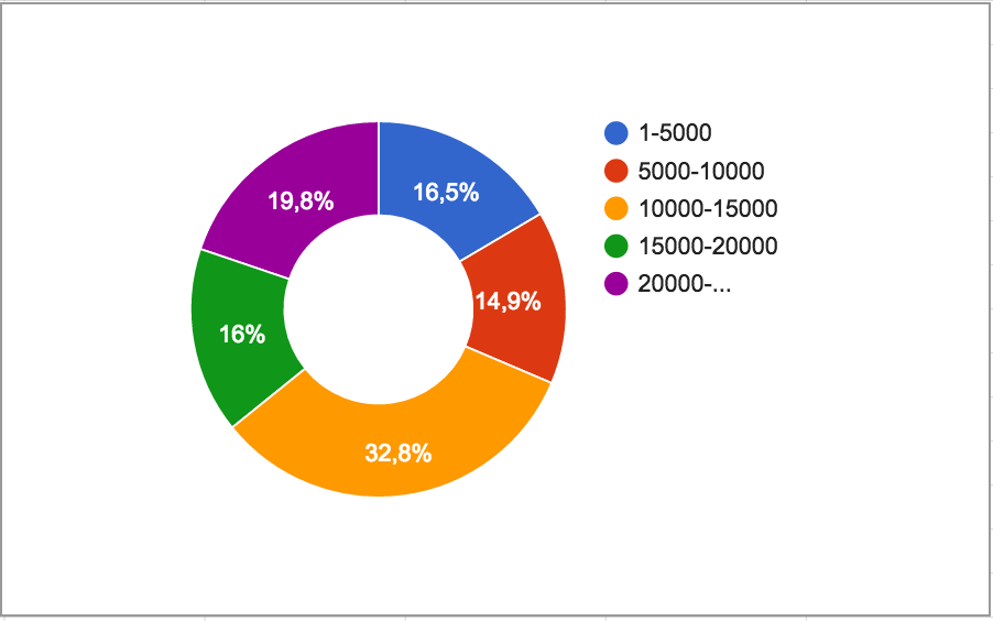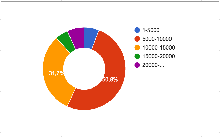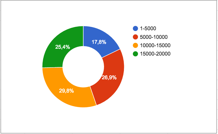 Анализ показал, что на всех рассматриваемых нами ресурсах большинство компаний предпочитают публиковать тексты длиной от 5000 до 10000 знаков с пробелами. К примеру, вот так выглядит соотношение статей по числу знаков, опубликованных компаниями на VC.ru: