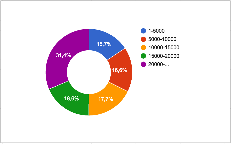 Несколько неожиданно на втором месте оказались короткие тексты, до 5000 знаков, это значит, что если материал по-настоящему актуален и «попадает» в аудиторию, то он может и не быть очень длинным. Хотя и лонгриды свыше 20000 символов пользователи «Хабра» очень любят — такие тексты на третьем месте по популярности.